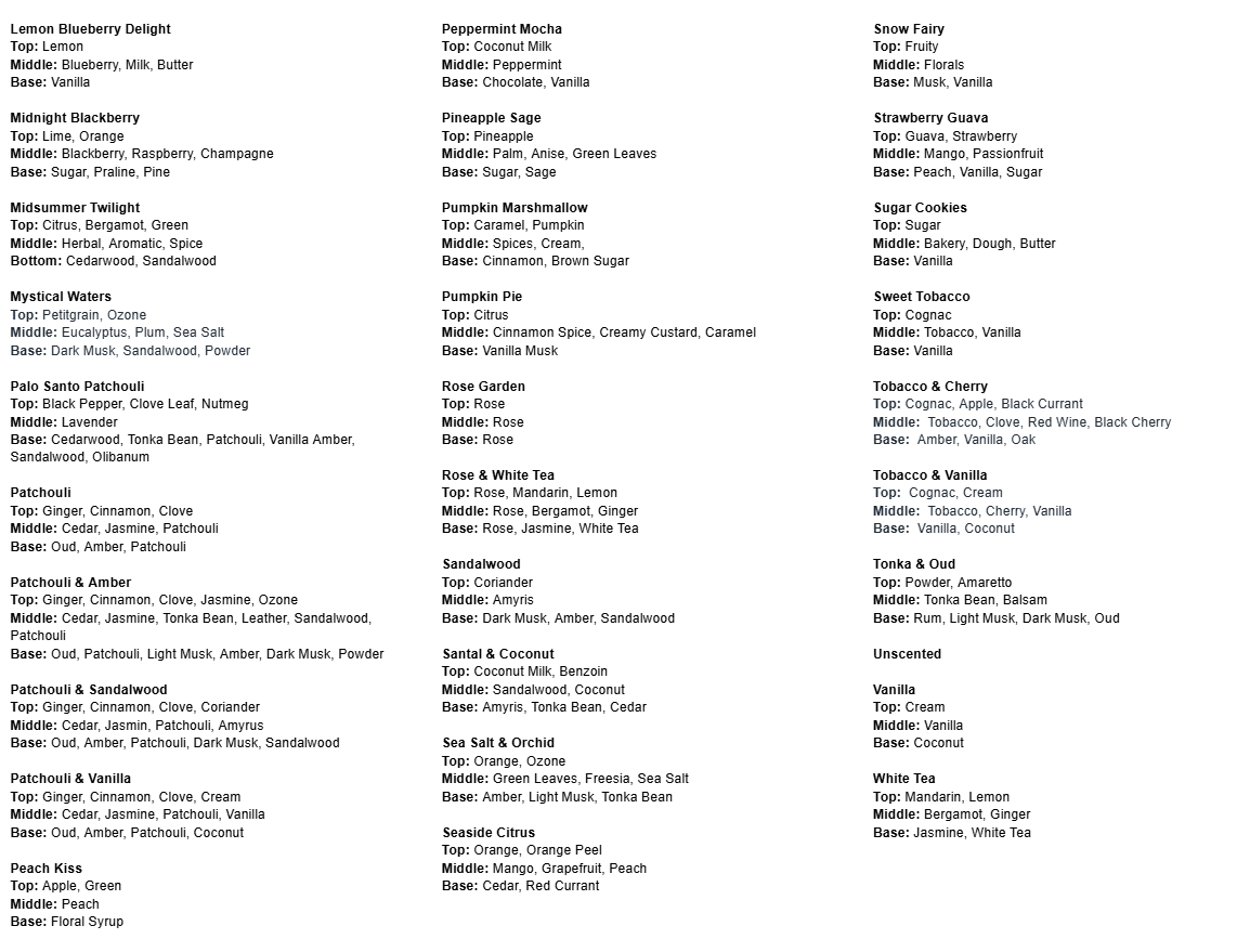 A complete updated list of scents can be found here: https://rosecreekcandleco.com/blogs/news/scent-notes-for-our-fragrances